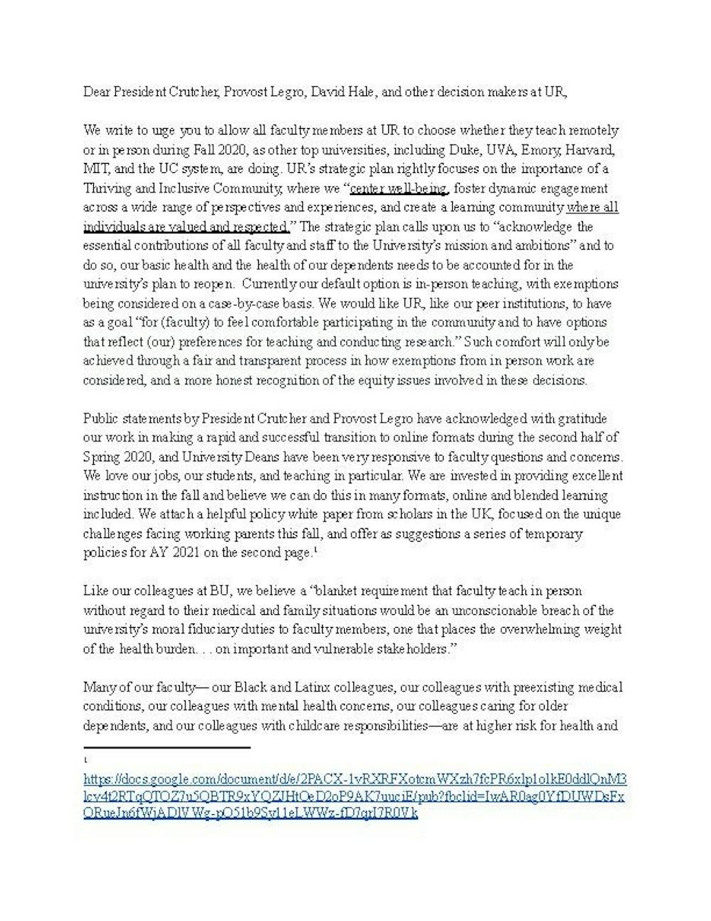 Letter signed by more than 50 professors in the School of Arts and Sciences requesting flexibility for remote learning for the fall semester, which was sent in an email to the UR administration on June 24. Click on the image above to read the full, five-page letter.