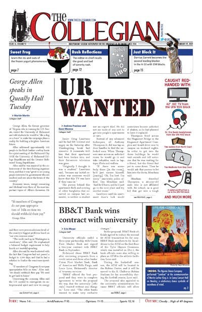 George Allen, the former governor of Virginia who is running for U.S. Senate, visited the University of Richmond and told students he would be "like a dog on a bone" to make his campaign plans a reality for building a brighter American future. Allen addressed approximately 100 people in his black leather cowboy boots for a joint meeting of the Richmond City GOP, the University of Richmond College Republicans and the Greater Richmond Young Republicans. Allen said he was inspired by the cohesiveness of the three hosting organizations, and that it was "great to see young people interested in government who are involved and care about the future of the country." Economic issues, energy resourcing and Medicaid were three of the most important topics of Allen's discussion.